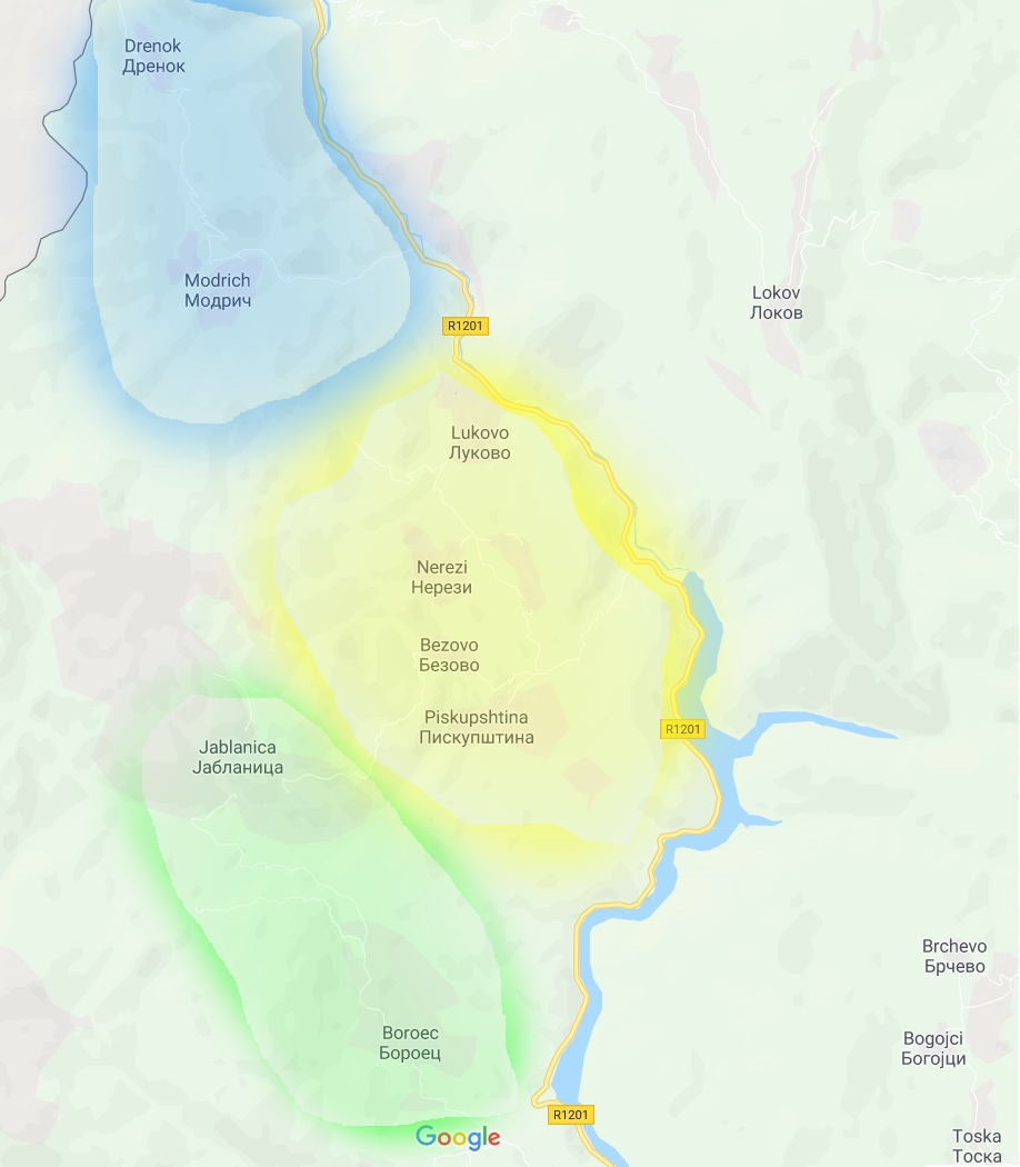 На север, кон Дренок, границата оди по текот на Дримот на местото Порта, оттаму на Горна Краста и Сениште, па на Ветерник, така што на селото Модрич, односно Долни Дримкол, му останува целиот вис Филипица.
